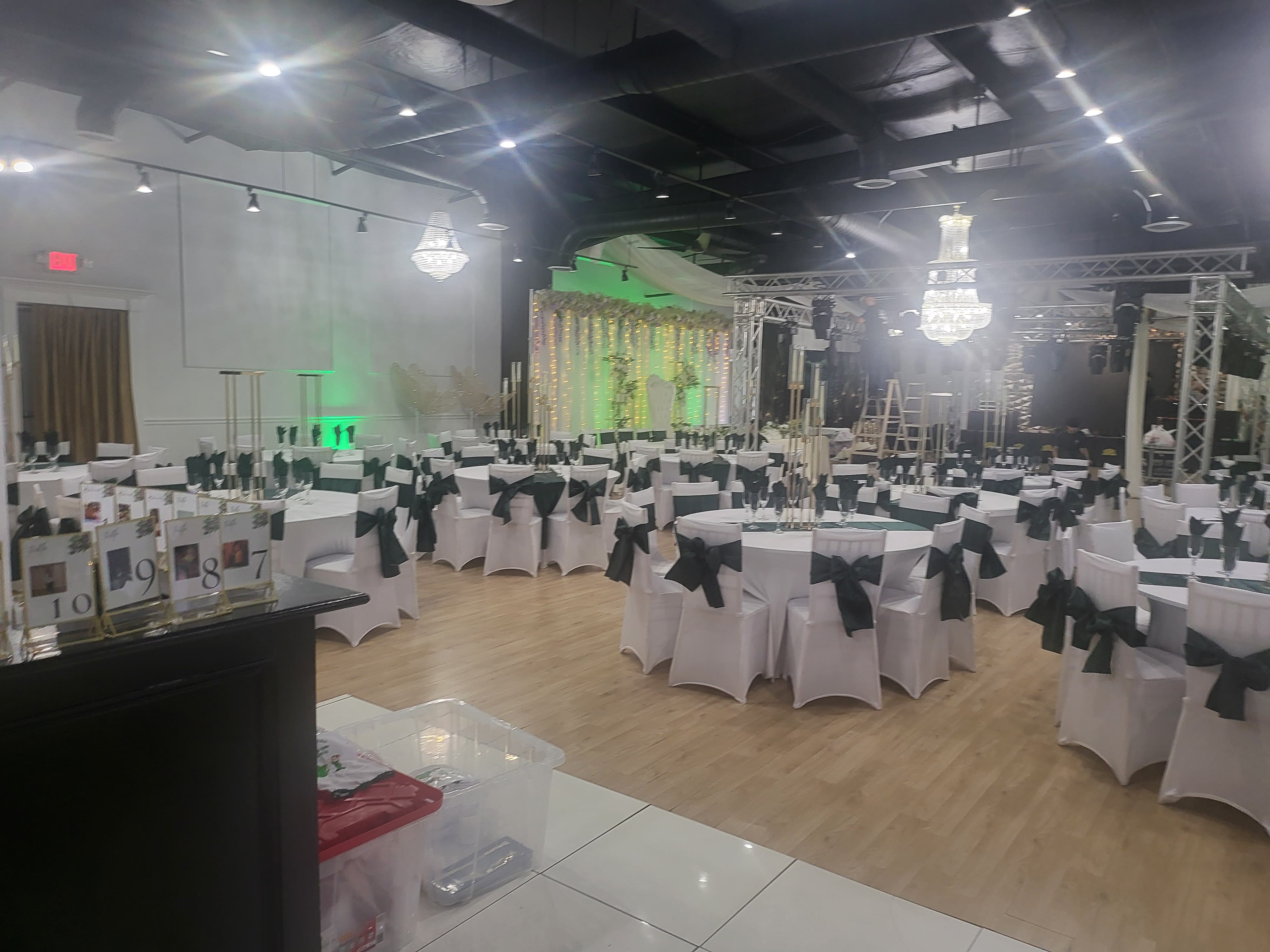 Our venue features a stunning banquet-style hall adorned with elegant chandeliers, customizable décor, and flexible seating arrangements. The space is designed to accommodate up to 250 guests for a variety of events.